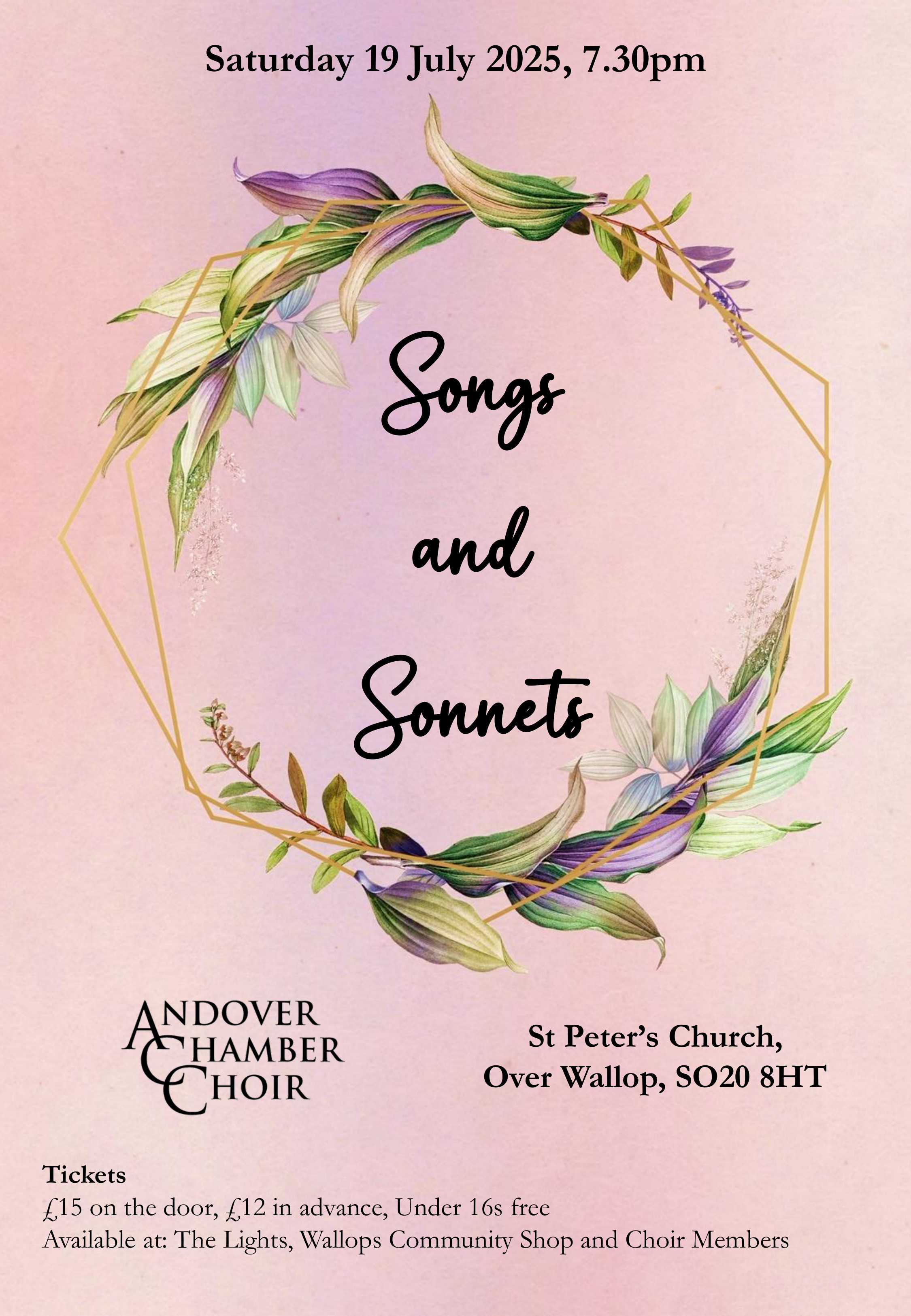 SONGS AND SONNETS This summer, Andover Chamber Choir will perform a mixed programme of music that captures the spirit of summer and provides a delightful evening of entertainment. From jazz settings of Shakespeare to music from his time, and from the heady harmonies of Elgar and Ireland to classic British folksongs, the programme includes something for everyone. Of particular note, the programme will include two Hampshire folksongs collected and arranged by Gustav Holst. The musical pieces will be complemented by readings chosen by Prof. Michael Wheeler, chairman of the choir. Interim Musical Director Amy Walters said, “After a packed programme of sacred pieces for the last few months, we are now enjoying a return to the secular and musical choices that include both the light-hearted and the dramatic. We are learning some new and some more familiar repertoire, and we can’t wait to share it with our audience. Over Wallop - a quintessential English village - is an ideal location for this repertoire.” The concert takes place on Saturday 19 July at St Peter’s Church, Over Wallop, SO20 8HT, beginning at 7.30pm. Tickets are £15 on the door or £12 in advance from The Lights (in person, telephone or online), Wallops Community Shop and choir members. Under 16s are admitted free of charge. Light refreshments are included in the ticket price.