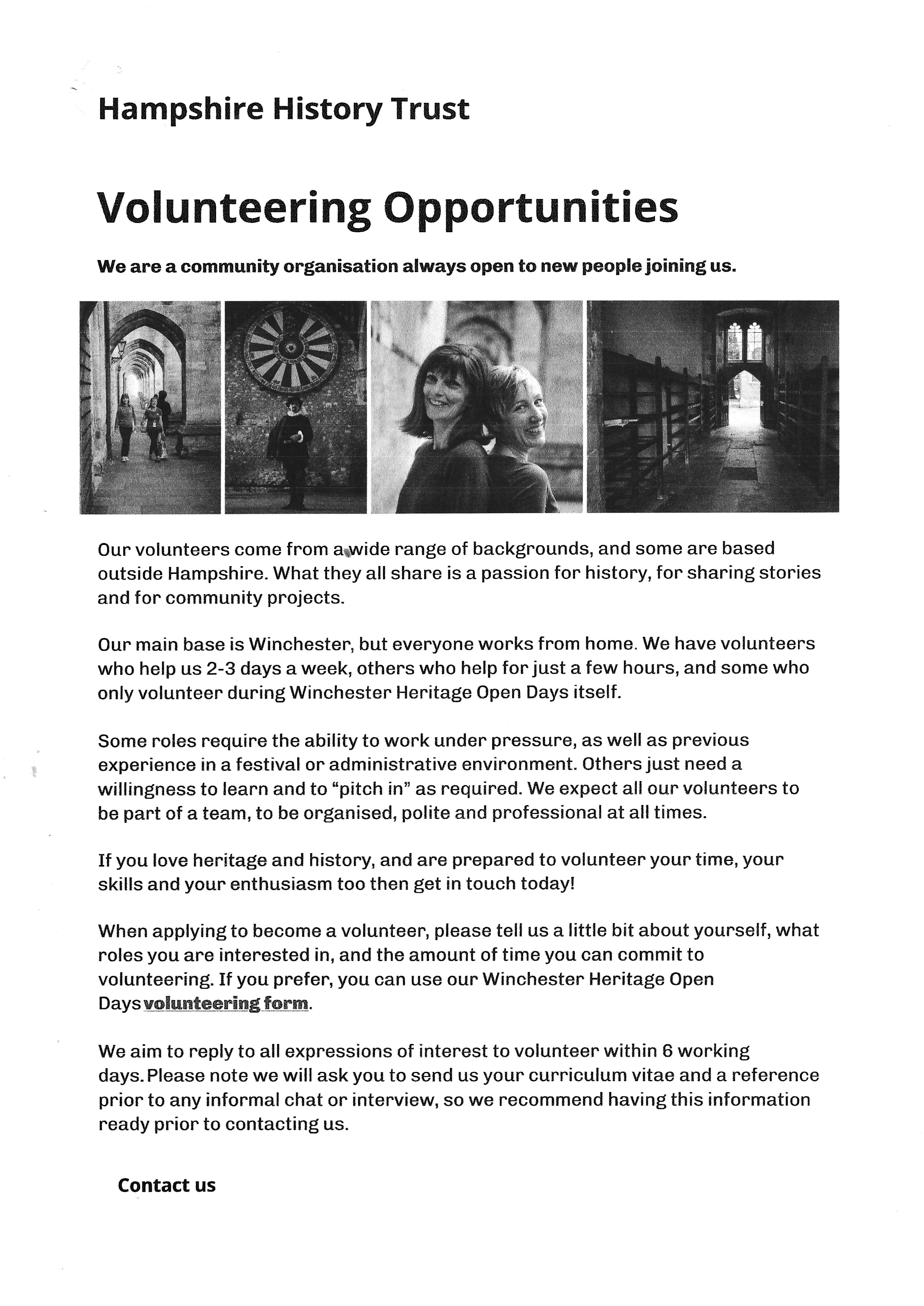 The Trust is a voluntary organisation committed to participation in history and heritage. It offers free or low cost history and educational projects, including its own podcast channel (Hampshire HistBites) and organises and promotes a programme of events for the Winchester Heritage Open Days festival every September across the county. Whilst the events themselves may be of interest to your members, the Trust is always looking for volunteers to support its activities and has a variety of roles available, Information on volunteering. If you require any additional information, and for volunteering, please visit the website www.hampshirehistorytrust.com.  |